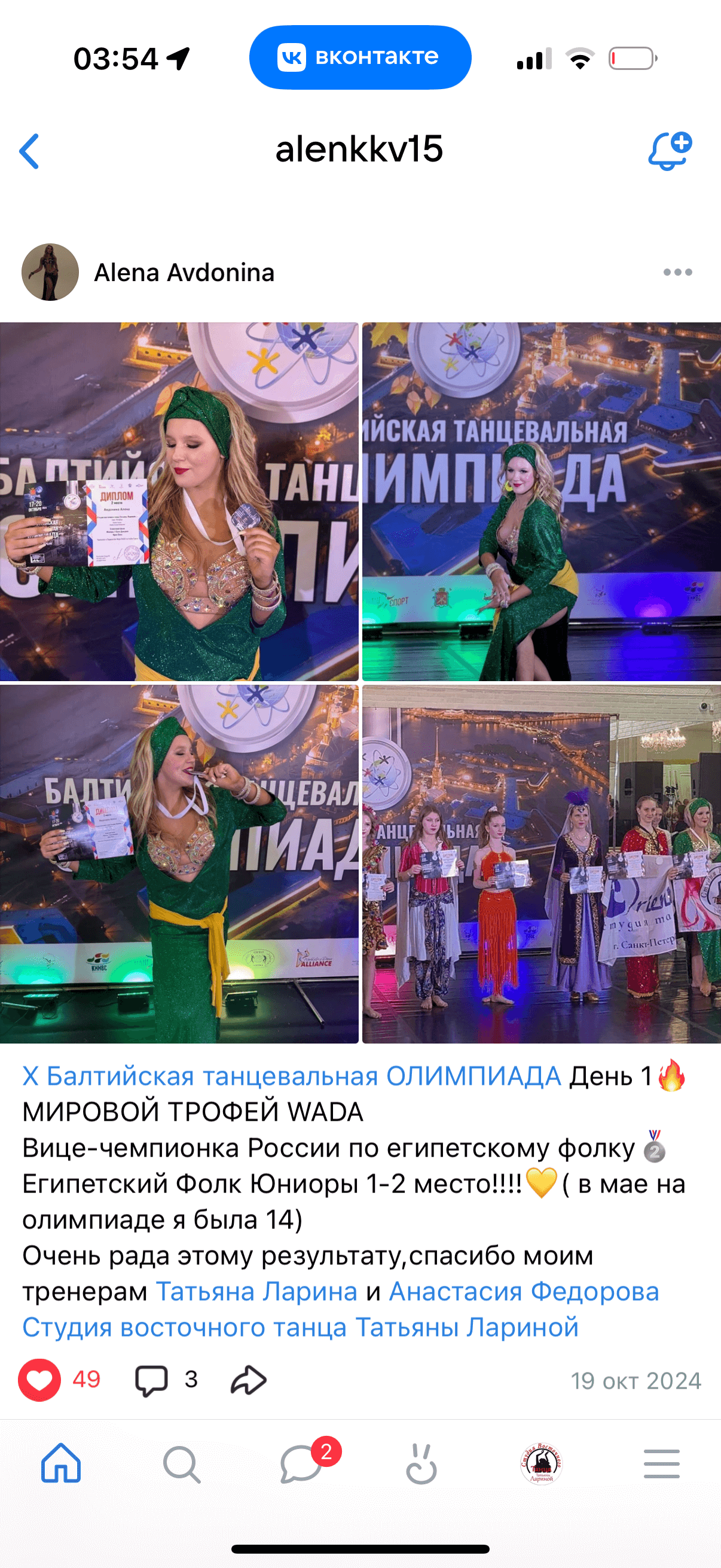 • Чемпионка мира и Европы по Belly dance (2012–2019).