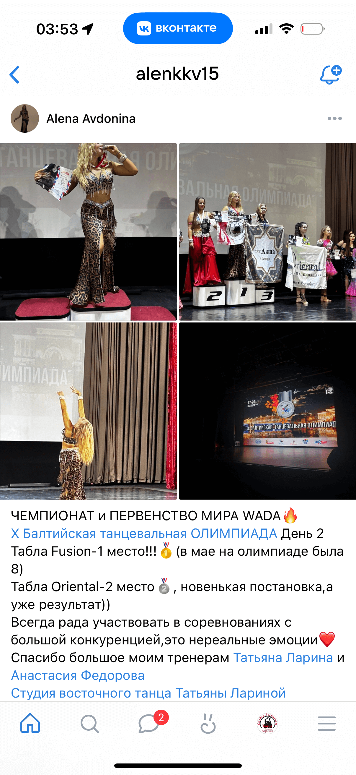 • Чемпионка мира и Европы по Belly dance (2012–2019).